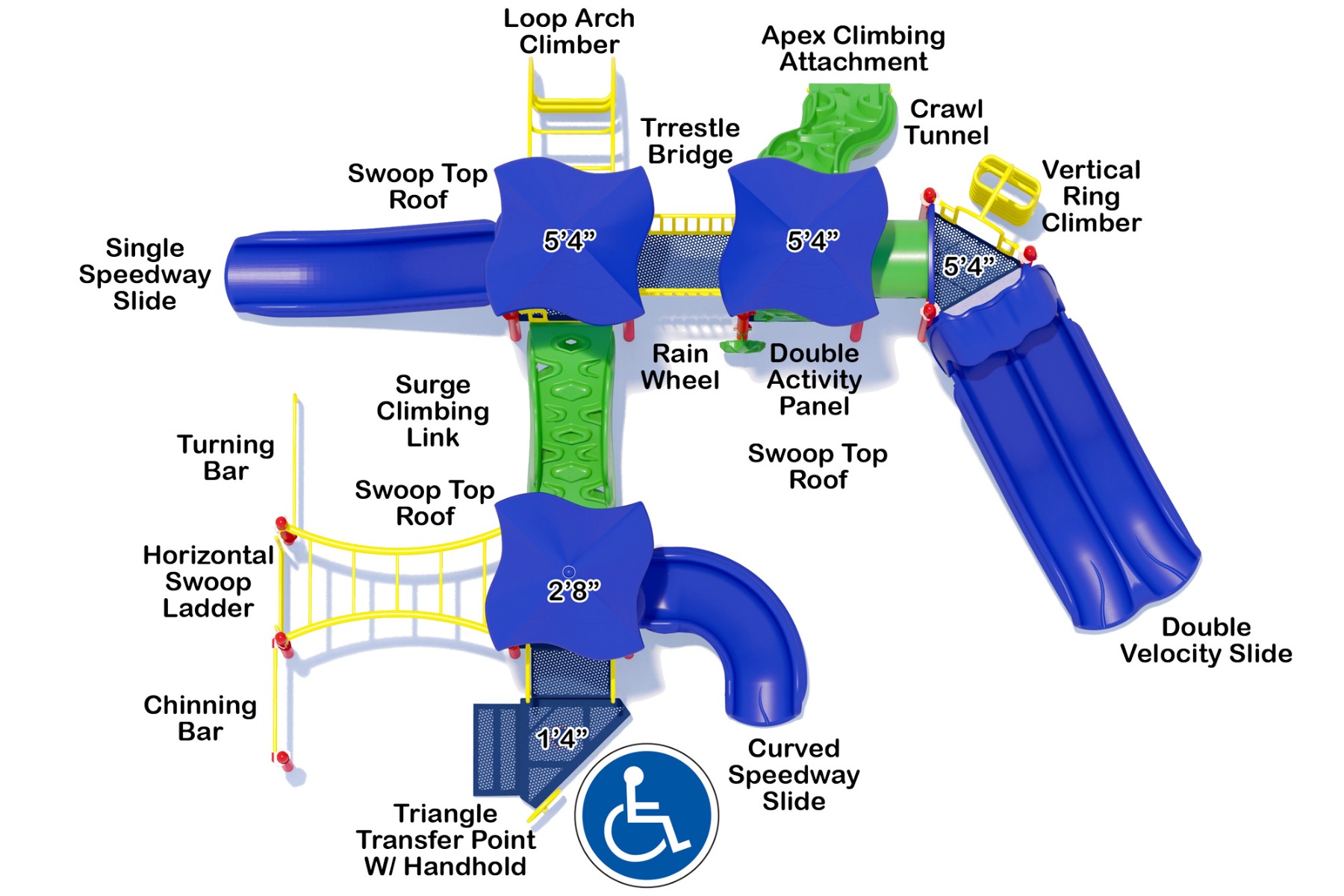 Groovy Gang is ADA accessible via Transfer Station with handhold, and meets or exceeds all requirements from the ASTM, and the CPSC. The upright posts are powder-coated to color choice, and carry a Lifetime Limited Warranty. All plastic components and punched steel decks carry a 15 year limited warranty. Metal pipes, rungs, loops, and rails come with a 50 year limited warranty.